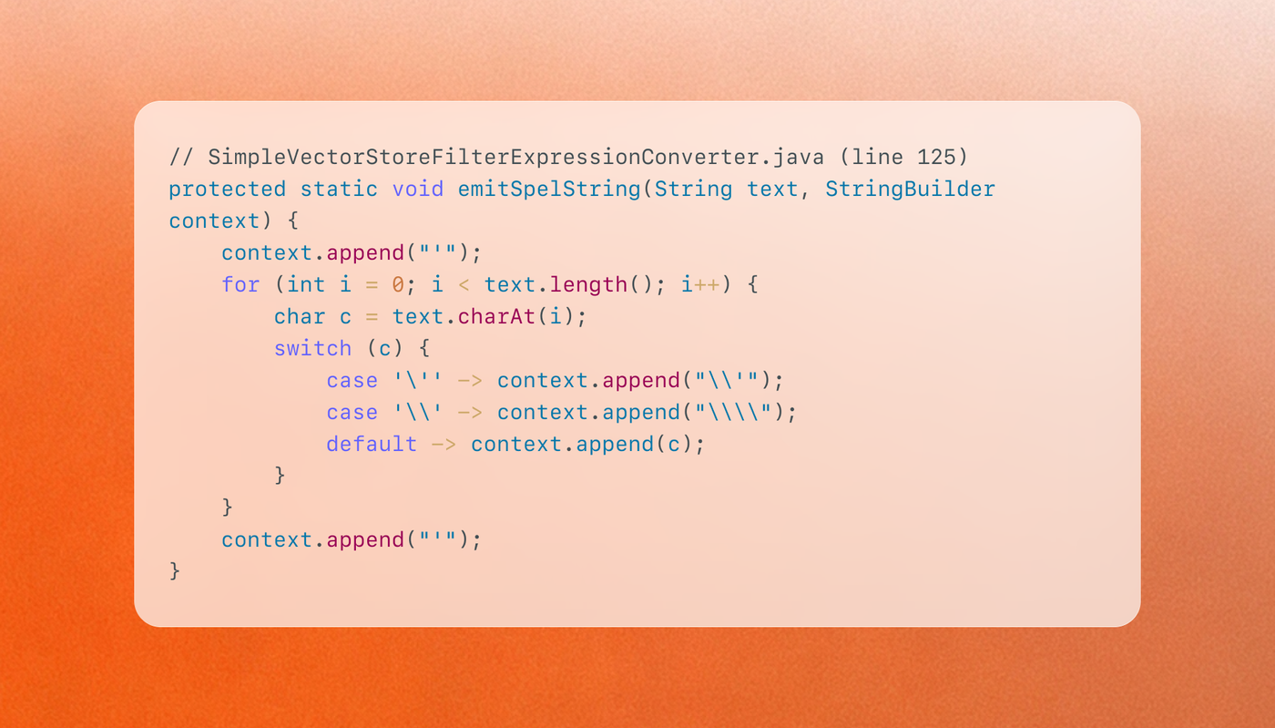 - The value/key sanitization asymmetry is a class of bug worth looking for. Wherever a system applies escaping or parameterization to one category of user input (values) but not another (keys, column names, identifiers), injection surfaces hide. SQL has this problem with column-name interpolation; Spring AI had it with SpEL metadata accessors. Apex caught this by comparing the sanitization applied to