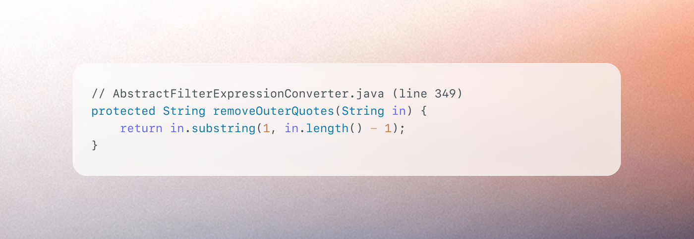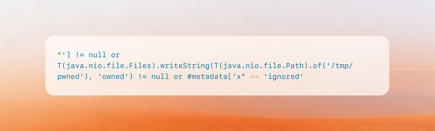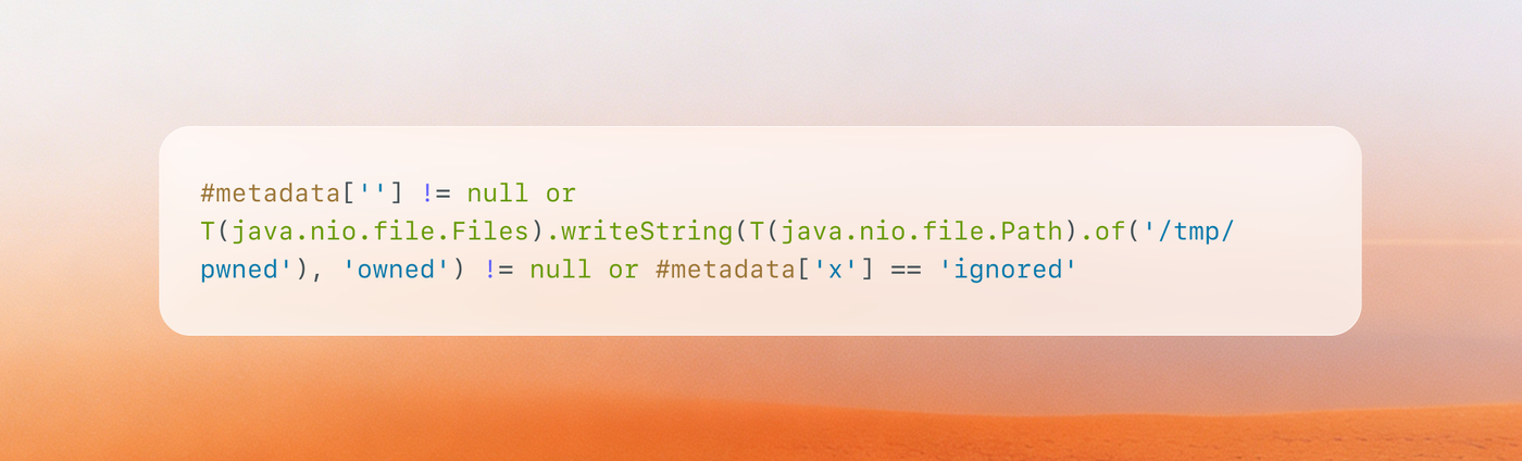 SimpleEvaluationContextwhen evaluating expressions that may contain untrusted content, precisely becauseStandardEvaluationContextenables type references and method invocation. But switching toSimpleEvaluationContextwould only have reduced impact; the correct fix was to eliminate string-based expression evaluation entirely. - Eliminating the intermediate representation is stronger than escaping it. The fix doesn't try to sanitize keys before splicing them into SpEL. It removes the SpEL layer completely. Walking the AST directly makes injection structurally impossible because there is no string to break out of. When a filter system converts a structured AST to a string only to parse it back into executable form, that round-trip is the vulnerability.