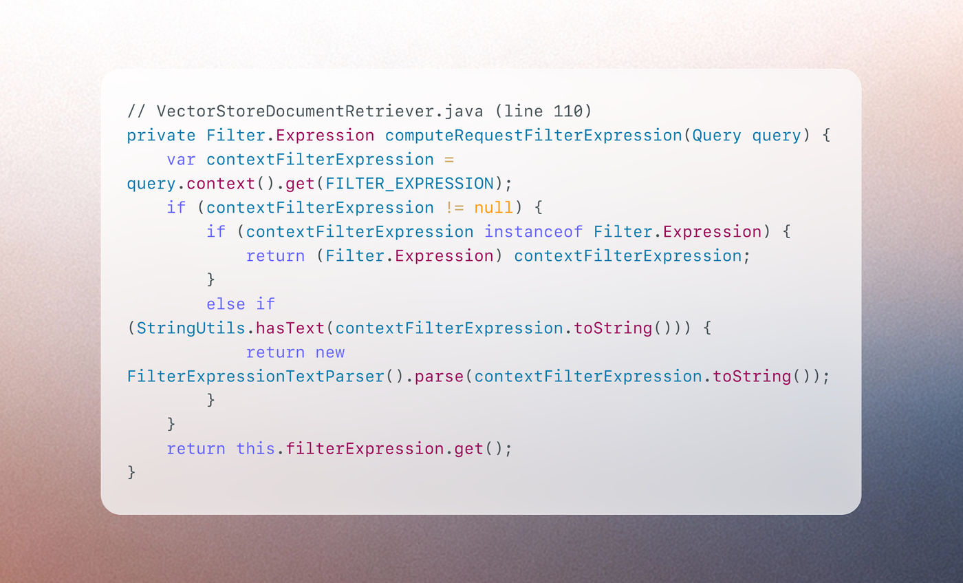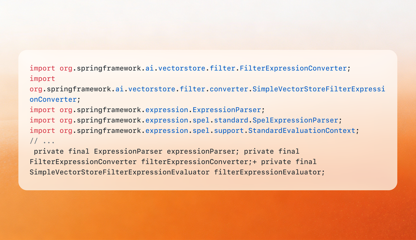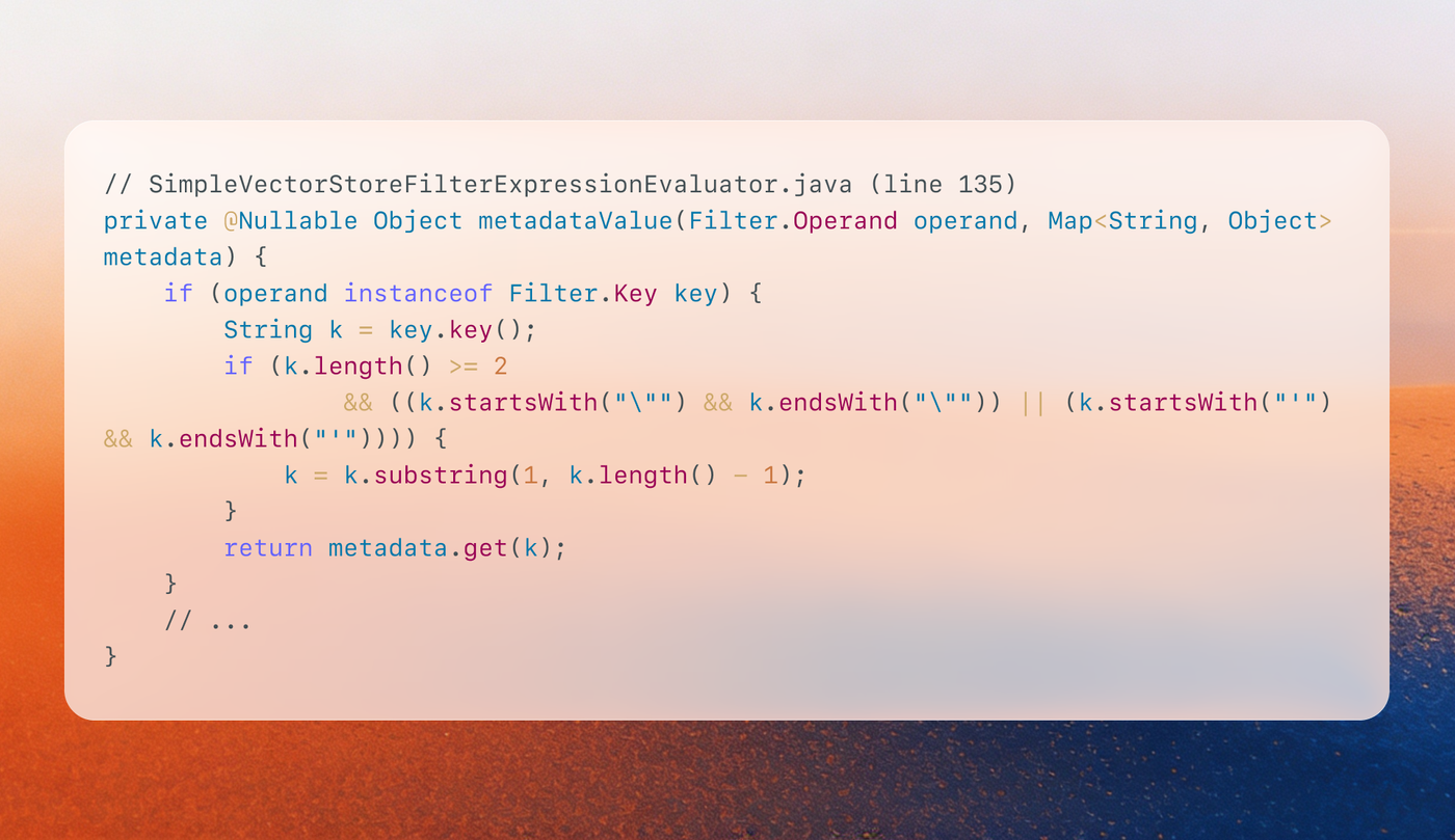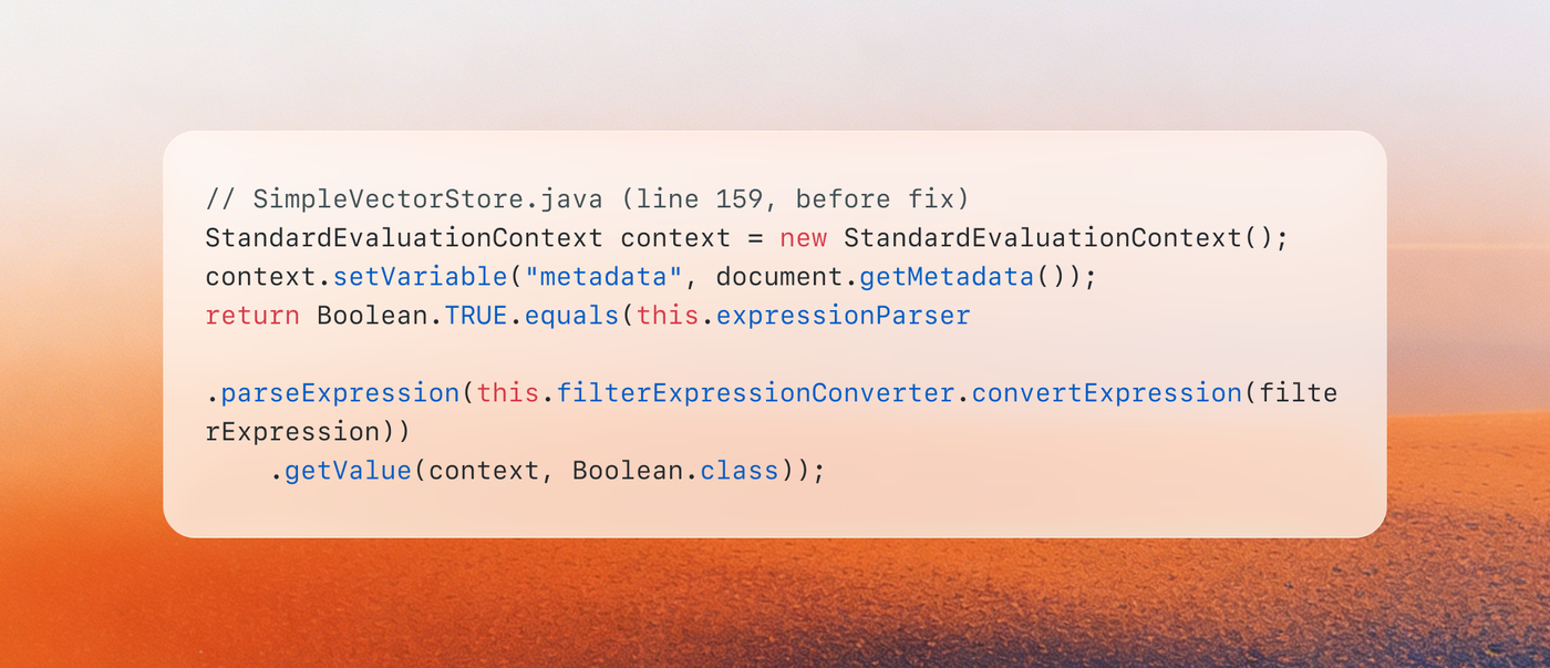 The fix, shipped in Spring AI 1.0.5 and 1.1.4, eliminates SpEL entirely. Filter expressions are now evaluated by walking the AST directly instead of converting to an intermediate string representation.