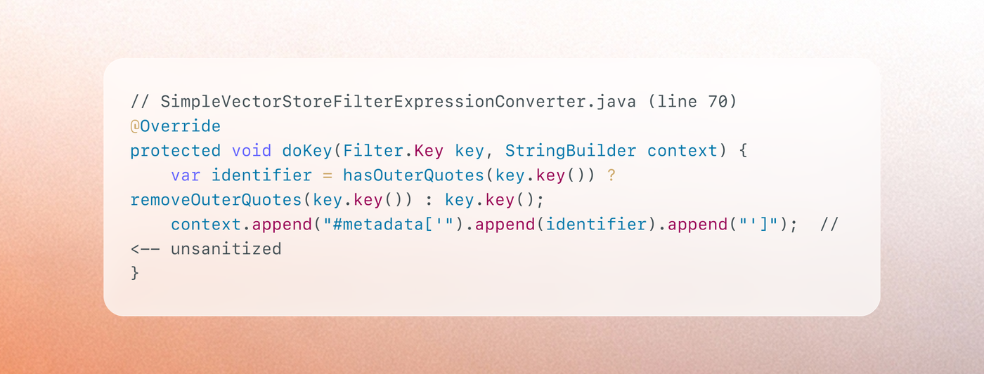 The vulnerability lives in SimpleVectorStoreFilterExpressionConverter.doKey(). This method takes a filter key (a metadata field name) and interpolates it into a SpEL metadata accessor:
