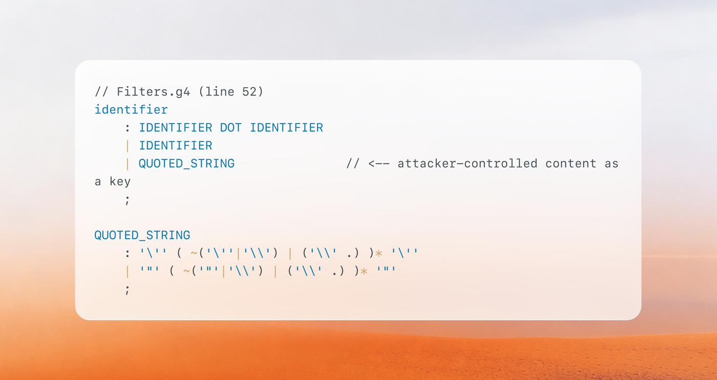 The asymmetry is the bug. Values are treated as untrusted data. Keys are treated as safe identifiers. But the ANTLR grammar allows keys to be QUOTED_STRING, arbitrary content between matching quotes: